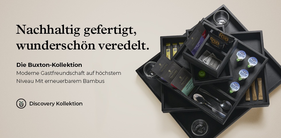 Unsere umweltfreundlichen Wasserkocher und Tabletts sind in einer Vielzahl von Größen, Ausführungen und Stilen erhältlich. Unsere Willkommenstabletts haben die Branche mit ihrem originellen Abtropffläche verändert und bieten den Gästen alles an, was sie für die Zubereitung eines entspannenden Heißgetränks brauchen.